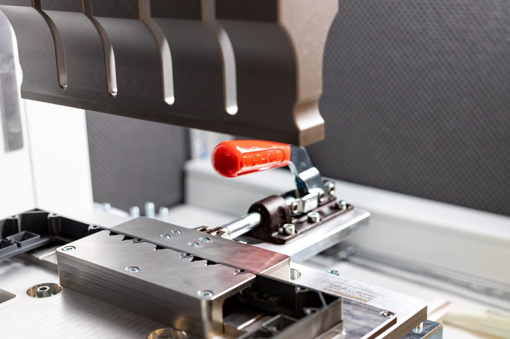 מסגרת הפלסטיק מהודקת במתקן שפותח במיוחד לתהליך הריתוך להטמעת הברגות הפליז באופן מלא ואחיד.